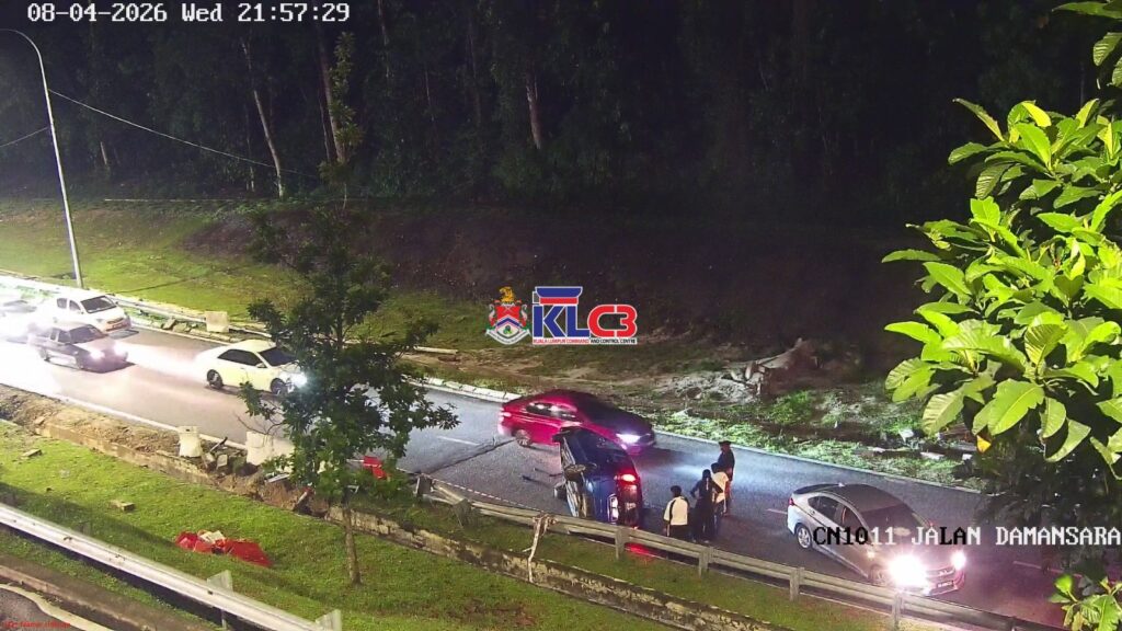 Sebuah kenderaan terbalik di lokasi Terowong Duta Baru menghala ke Jalan Damansara, lorong kanan terhalang, aliran trafik perlahan di lokasi.