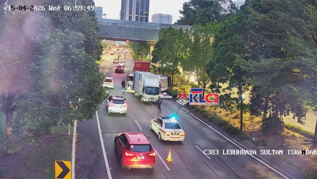 Sebuah lori terbalik di Lebuhraya Sultan Iskandar berhampiran Wisma Tani ke WTC. Polis trafik di lokasi. 2 lorong kanan terhalang. Aliran trafik sesak menghampiri lokasi.