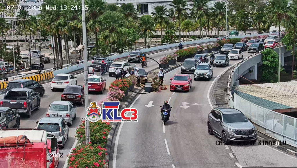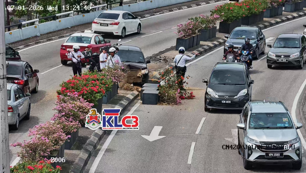 Kemalangan kereta terbabas melanggar pasu bunga di Jalan Kinabalu atas Bulatan Sultan Hishamuddin menghala ke Jalan Maharajalela. Polis Trafik di lokasi. Sebahagian lorong kanan arah Pusat Bandar terhalang.