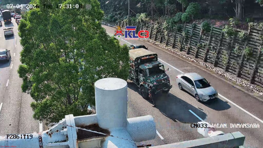Sebuah lori trak askar rosak di lokasi hadapan Muzium menghala ke Selatan, lorong tengah terhalang, aliran trafik perlahan di lokasi, Ranger KLC3 04 menghala ke lokasi.