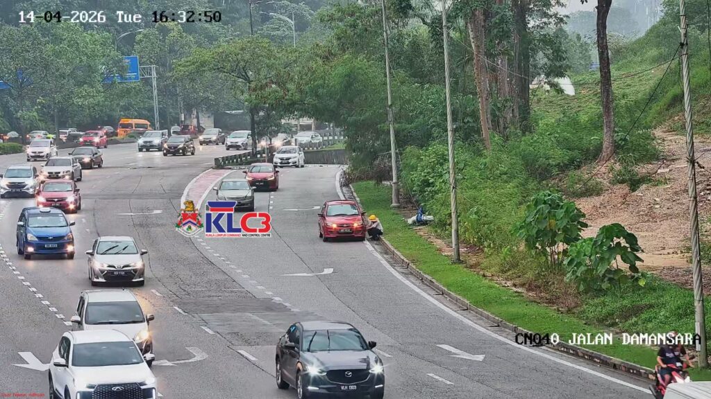 Sebuah kenderaan rosak di lokasi susur keluar dari arah Terowong Duta Baru ke Damansara, lorong kiri terhalang, aliran trafik perlahan di lokasi