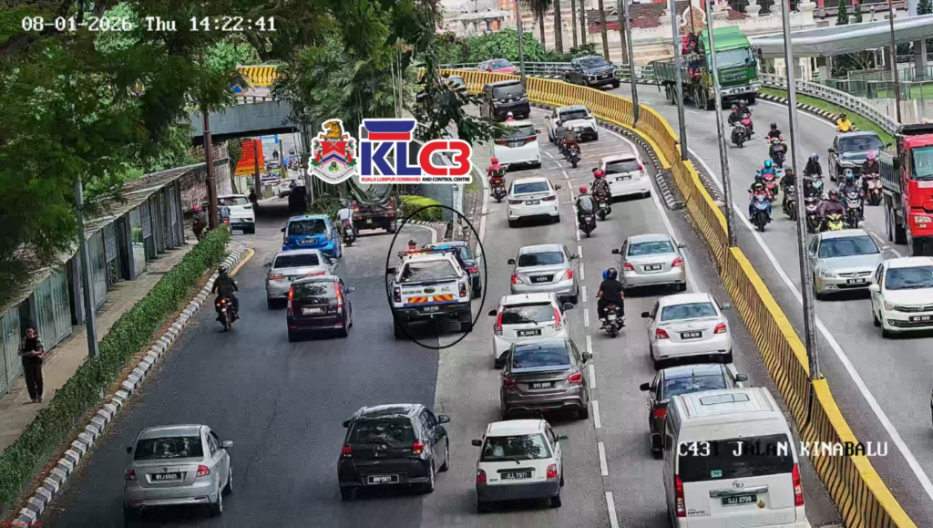 Sebuah kereta rosak ( habis minyak) di Jalan Kinabalu selepas Masjid Negara berhampiran susur Jalan Raja menghala ke Bulatan Dato Onn.