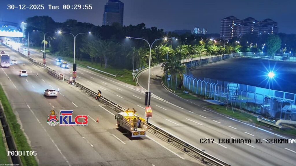 Kerja-kerja selenggara di Lebuhraya KL-Seremban ke arah Tol Sungai Besi. Satu lorong kanan terhalang. Aliran trafik lancar.
