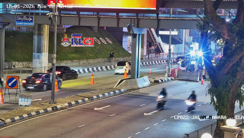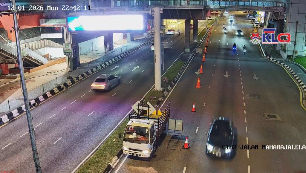 Jln Maharajalela: Kerja-kerja selenggara berhampiran Stesen Maharajalela. Lorong kanan ditutup sementara di kedua-dua arah, trafik perlahan.