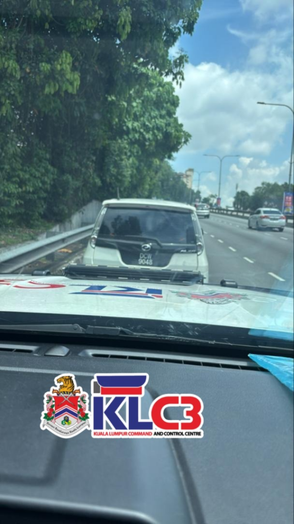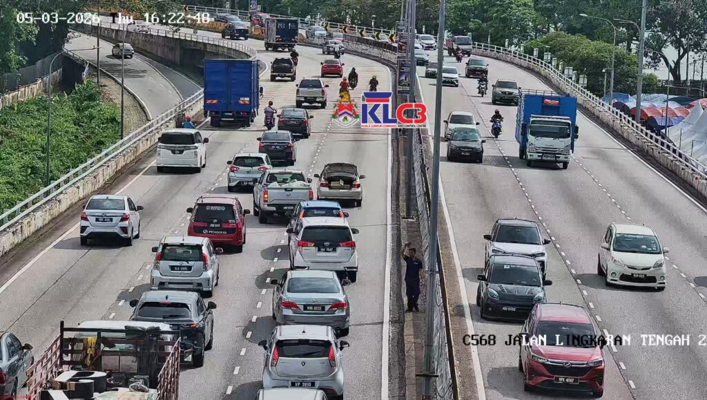Sebuah kenderaan rosak di lokasi selepas Bulatan Segambut menghala ke Pusat Bandar, lorong tengah terhalang, aliran trafik perlahan di lokasi, Warden Trafik DBKL di lokasi.