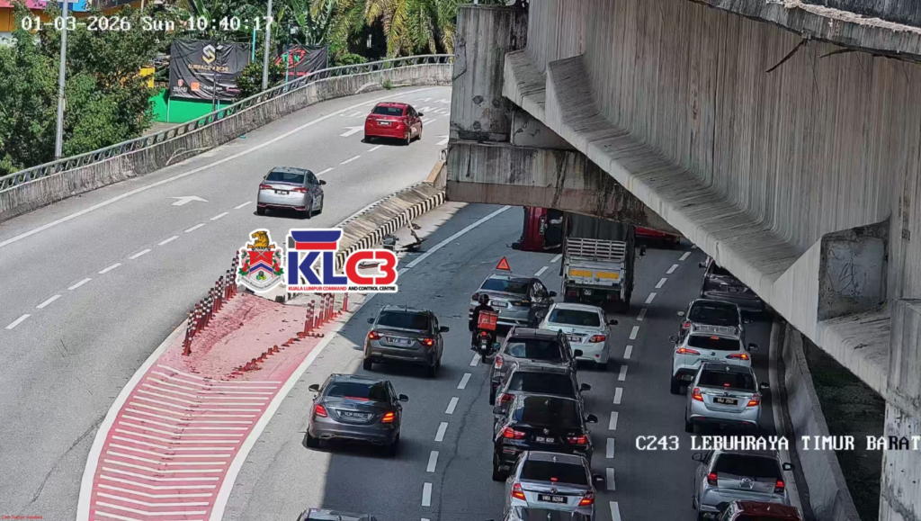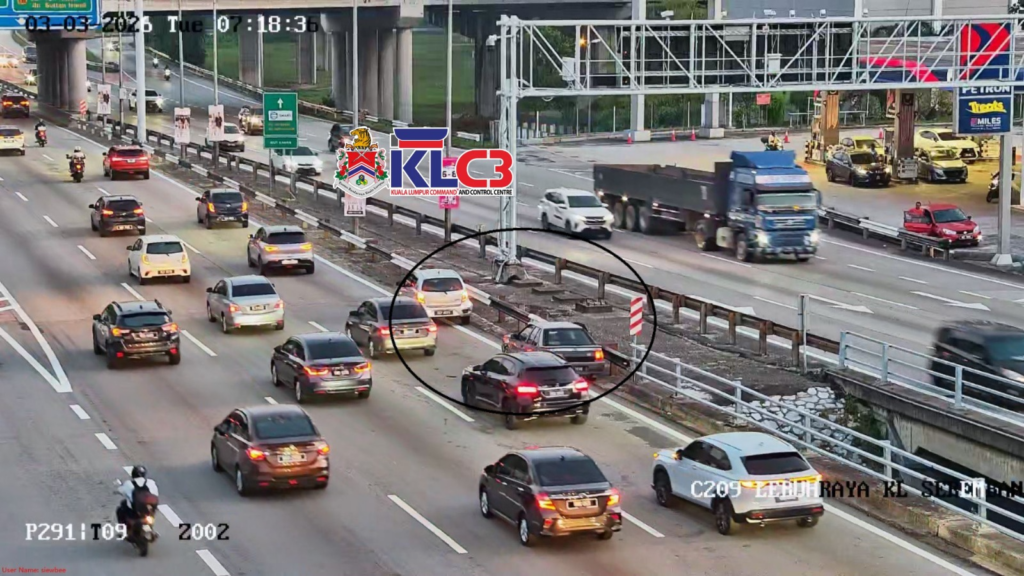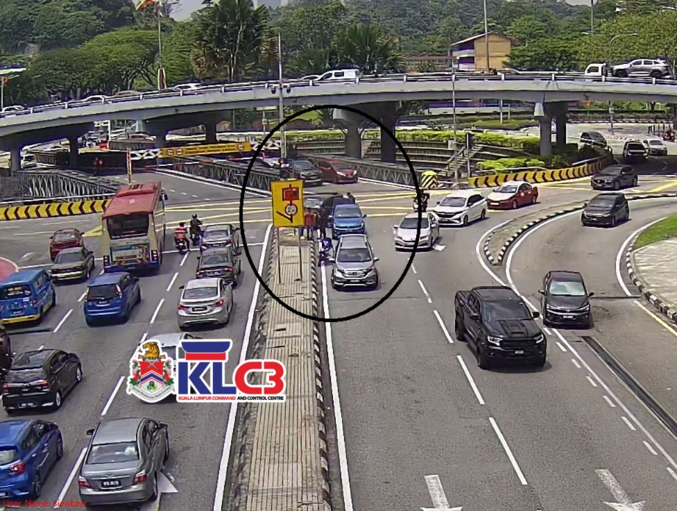 Sebuah kenderaan rosak di lokasi sebelum susur keluar Bulatan Dato Onn menghala ke Masjid Negara, Lorong kiri terhalang, aliran trafik perlahan di lokasi