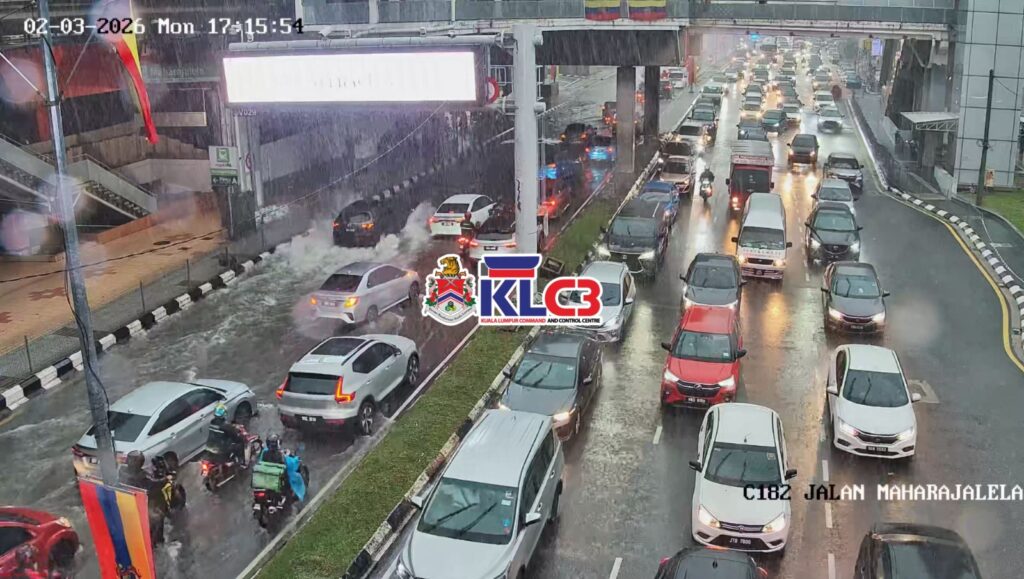 Aliran trafik perlahan, cuaca mendung dan hujan sekitar Pusat Bandar.