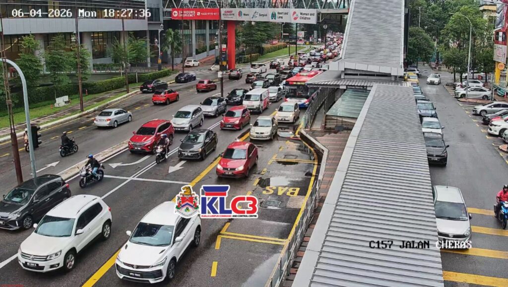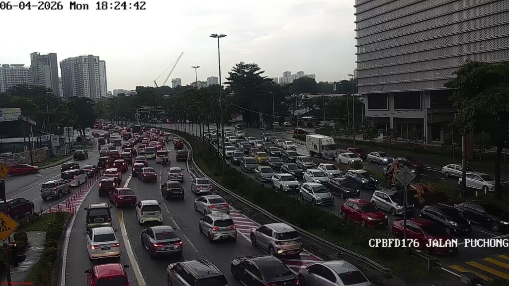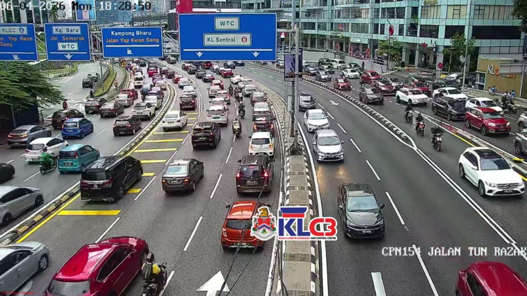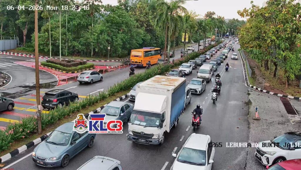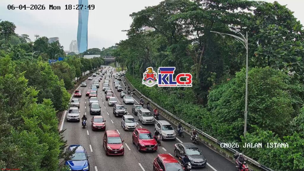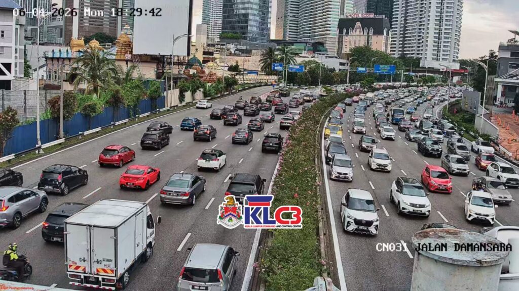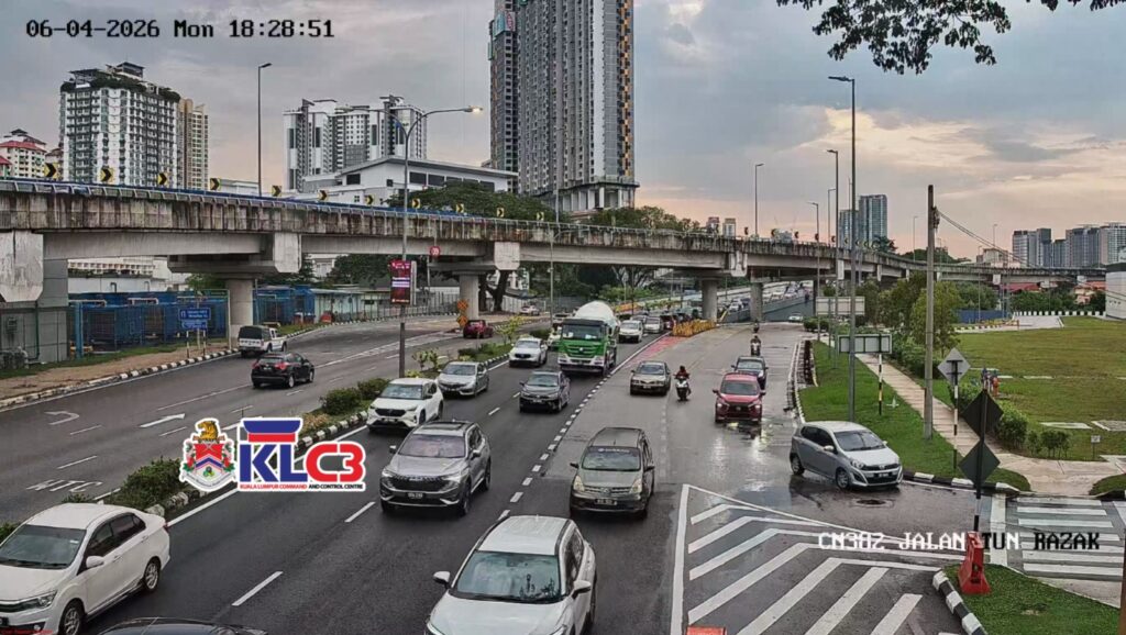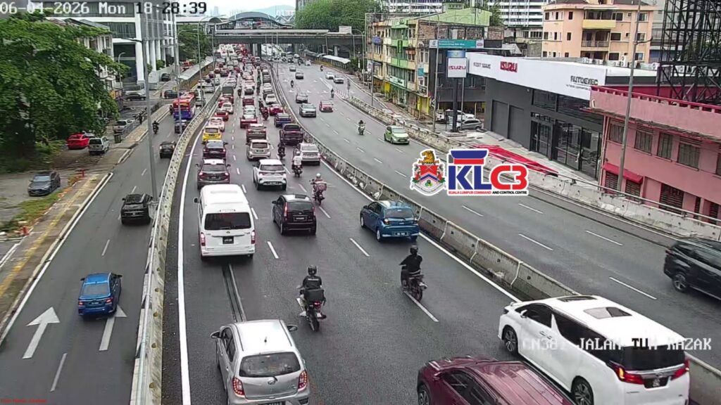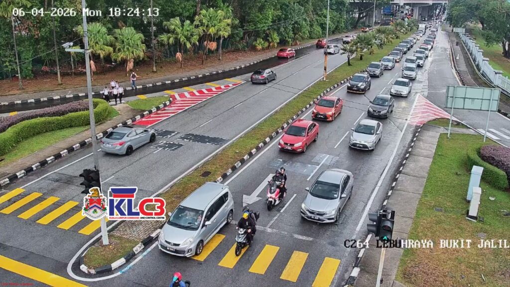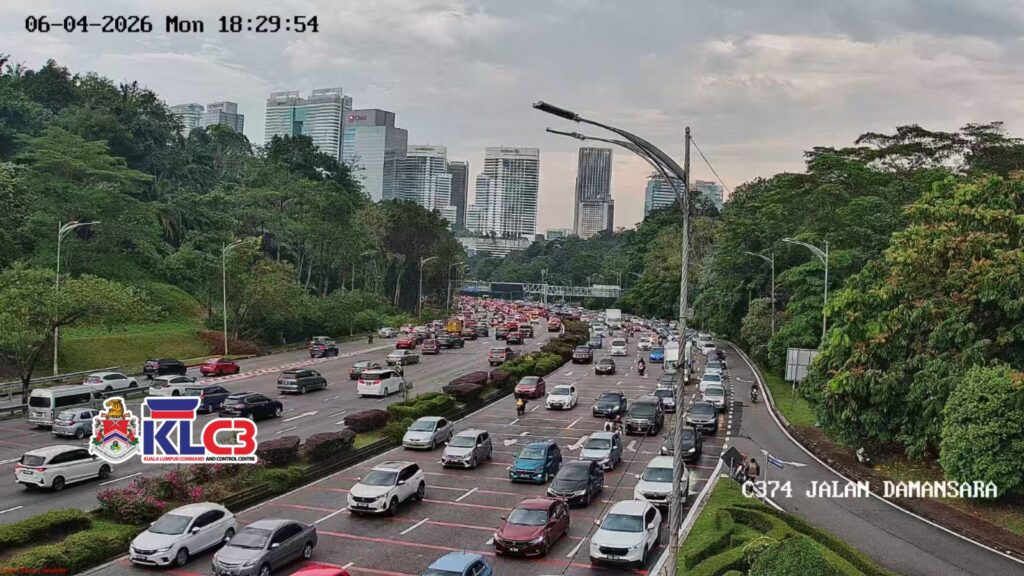 Aliran trafik tinggi, cuaca mendung dan hujan gerimis. Berhati-hati ketika memandu, jalan licin.
