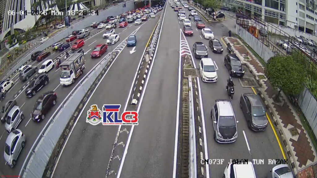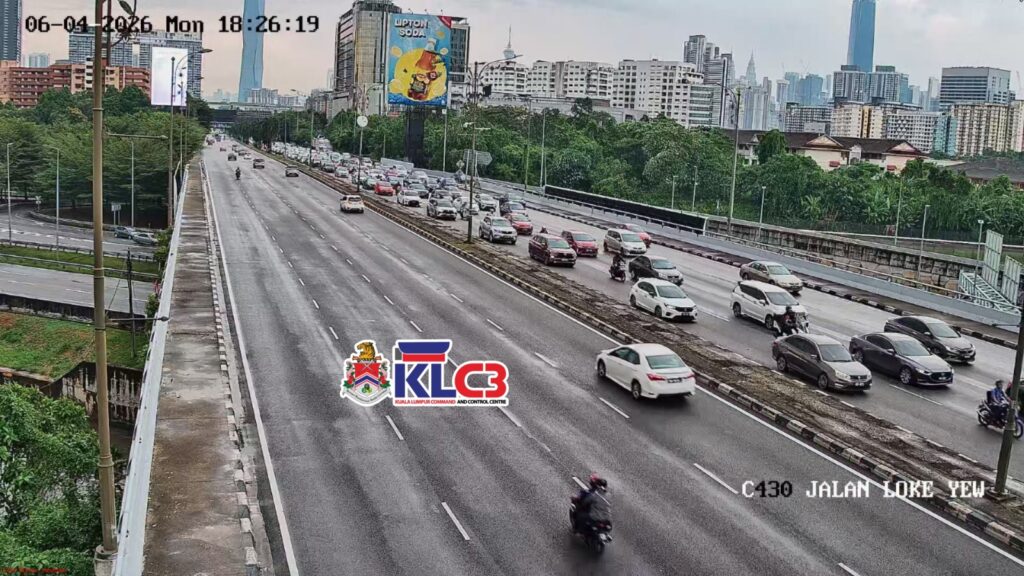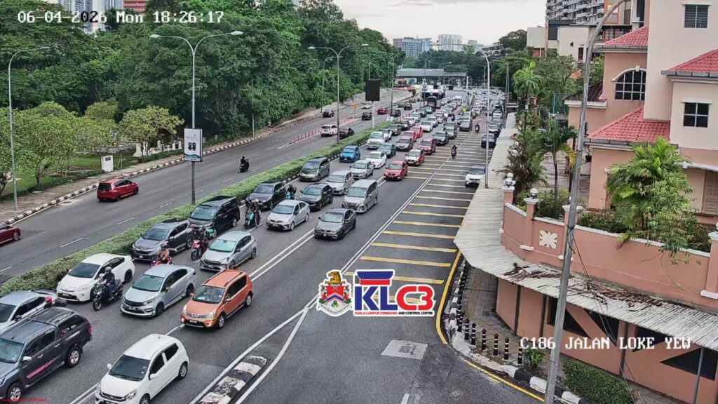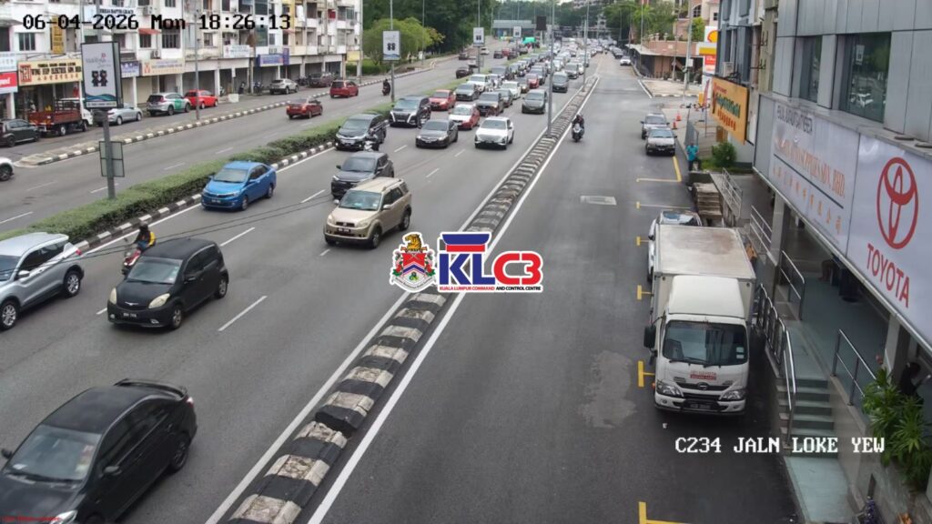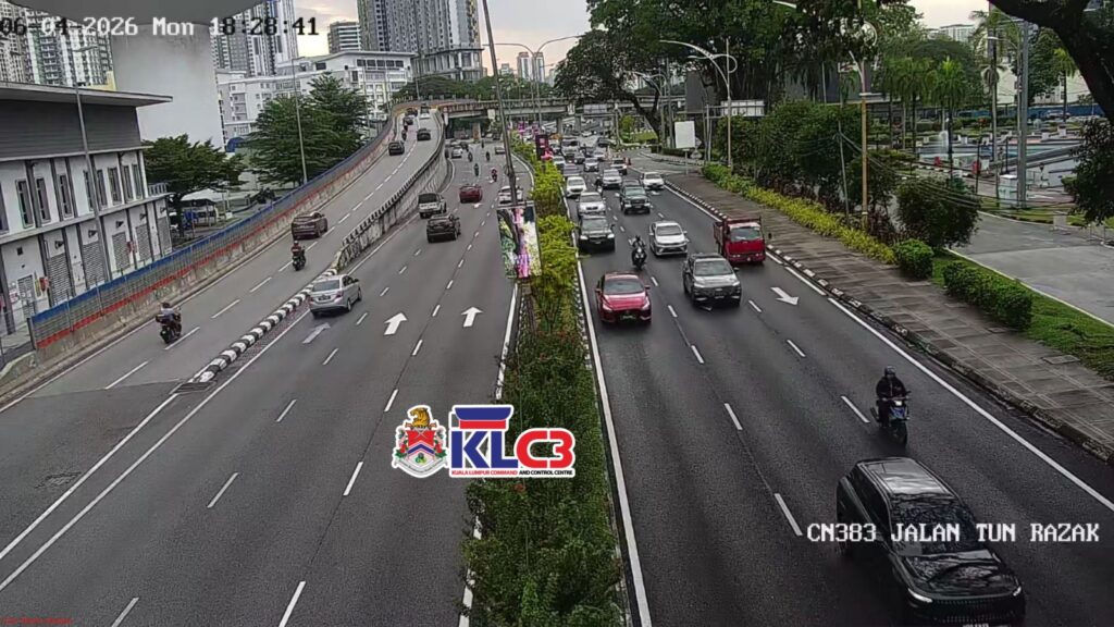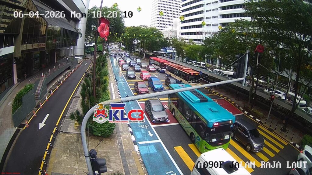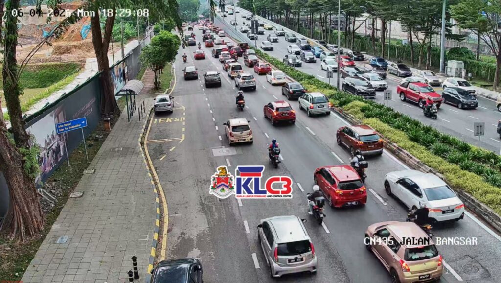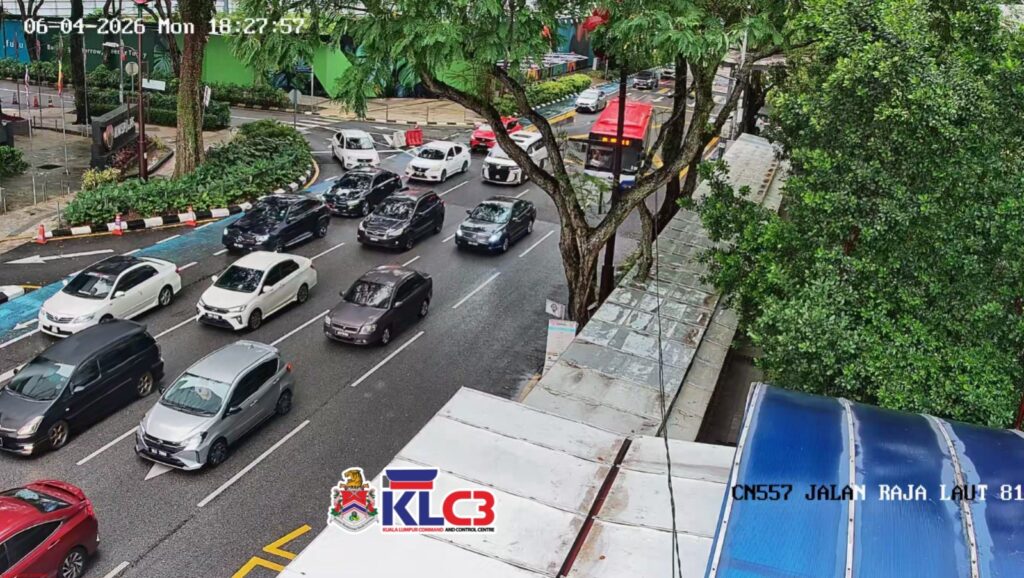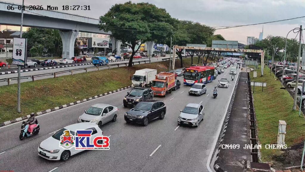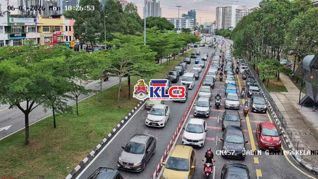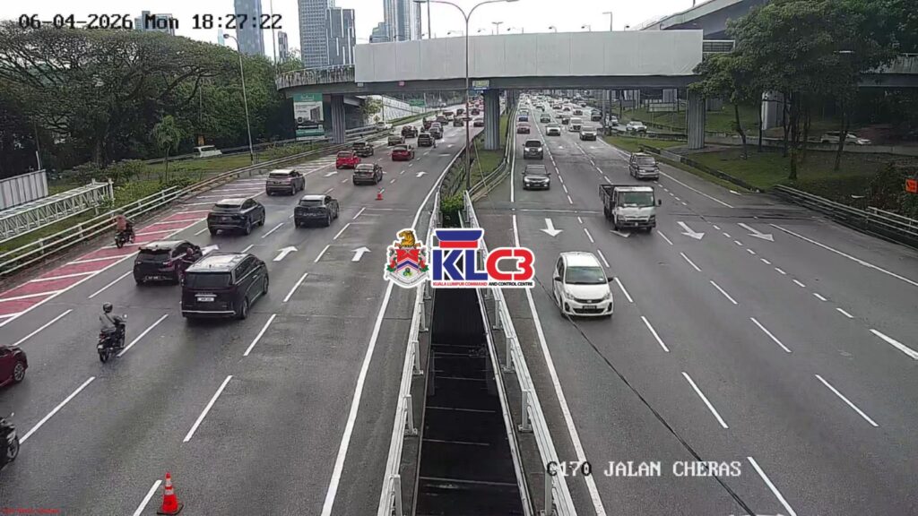 Aliran trafik tinggi, cuaca mendung dan hujan gerimis. Berhati-hati ketika memandu, jalan licin.