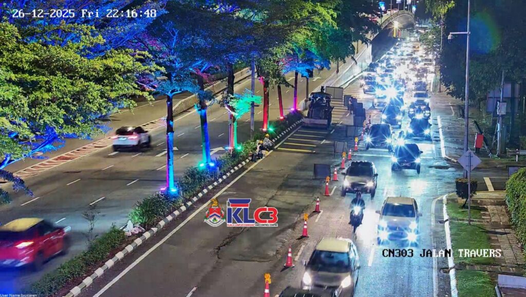 Kerja-kerja selenggara di Jalan Travers ke susur Jalan Damansara. Dua lorong kanan terhalang. Aliran trafik perlahan.