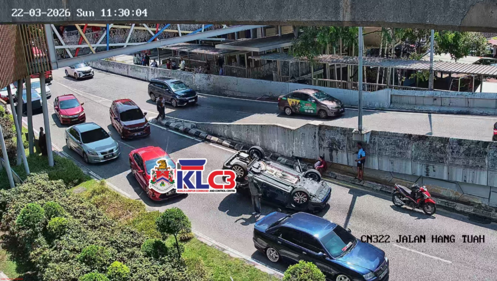 Sebuah kereta terbalik di Jalan Hang Tuah susur Ramp Dewan Bahasa menghala ke Jalan Maharajalela. Lorong kiri terhalang.