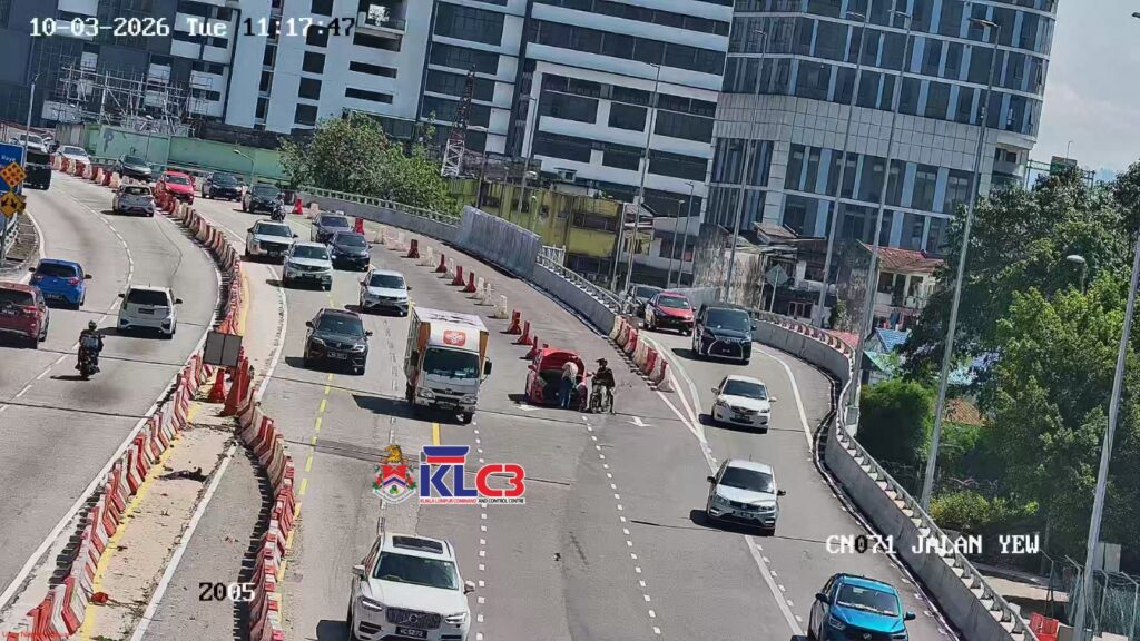 Sebuah kenderaan rosak di lokasi dari arah Jalan Yew menghala ke Sungai Besi, lorong kiri terhalang, aliran trafik perlahan di lokasi.