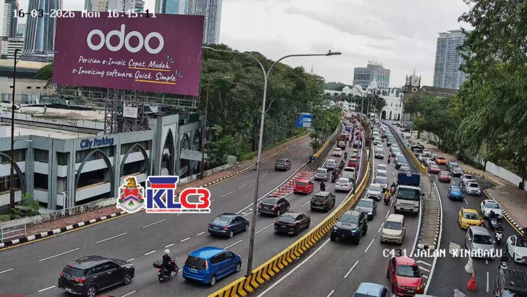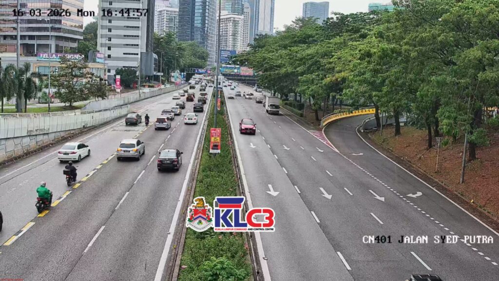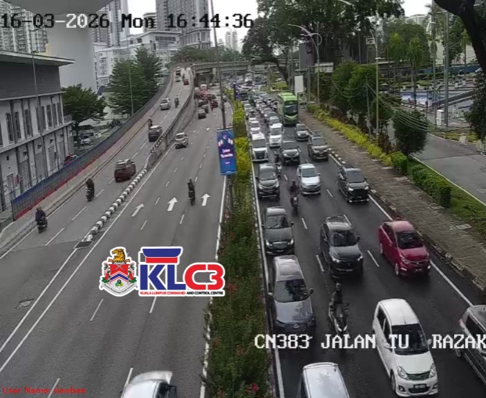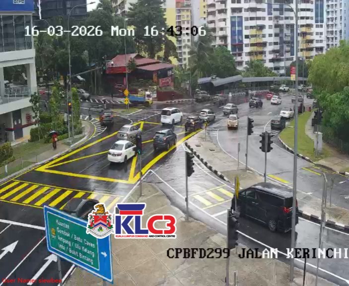 Aliran trafik perlahan, cuaca mendung dan hujan di sekitar Pusat Bandar.