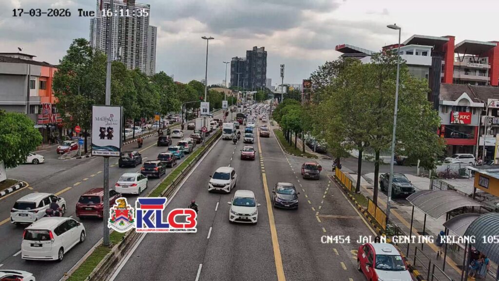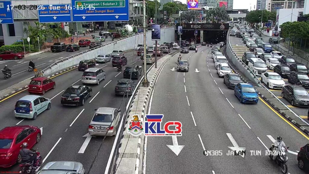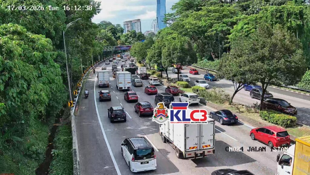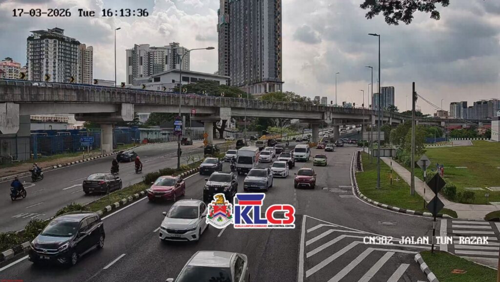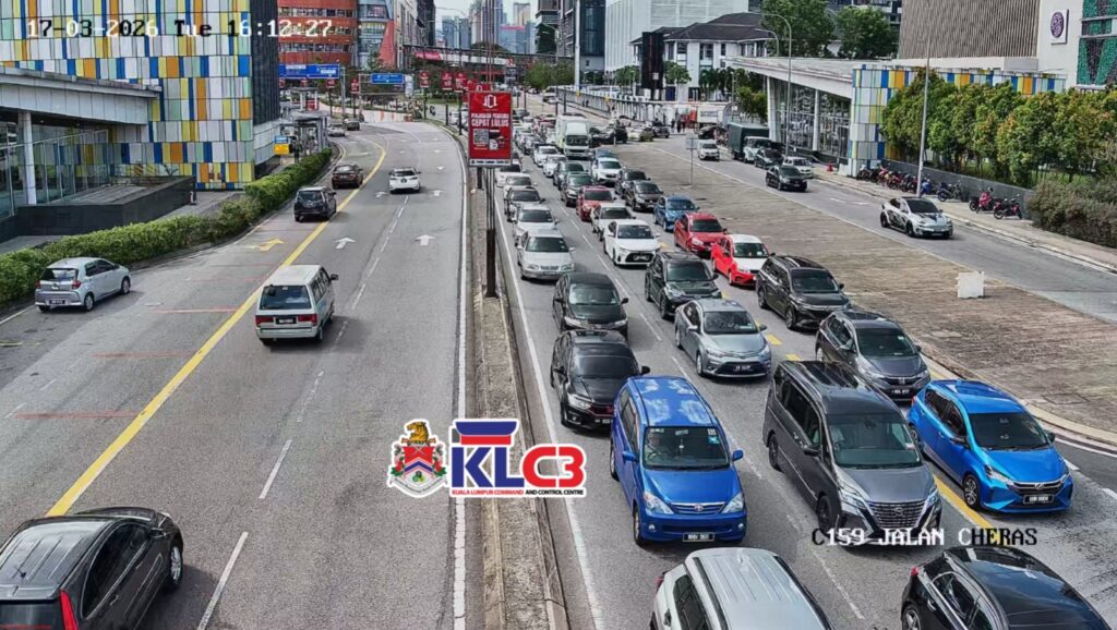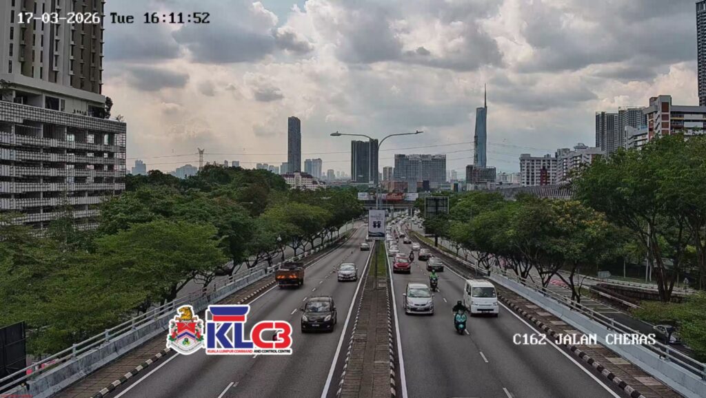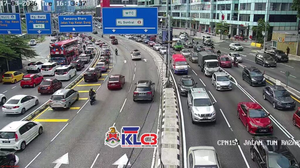 Aliran trafik tinggi, cuaca mendung sekitar Pusat Bandar.