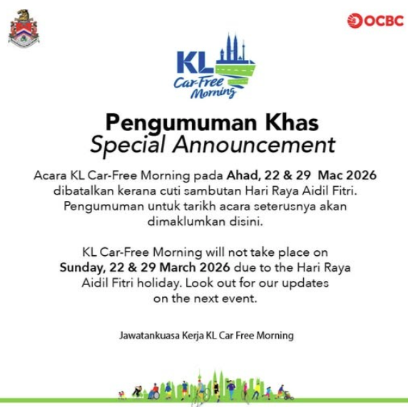 Tiada acara KL Car Free Morning esok. (29 Mac 2026)